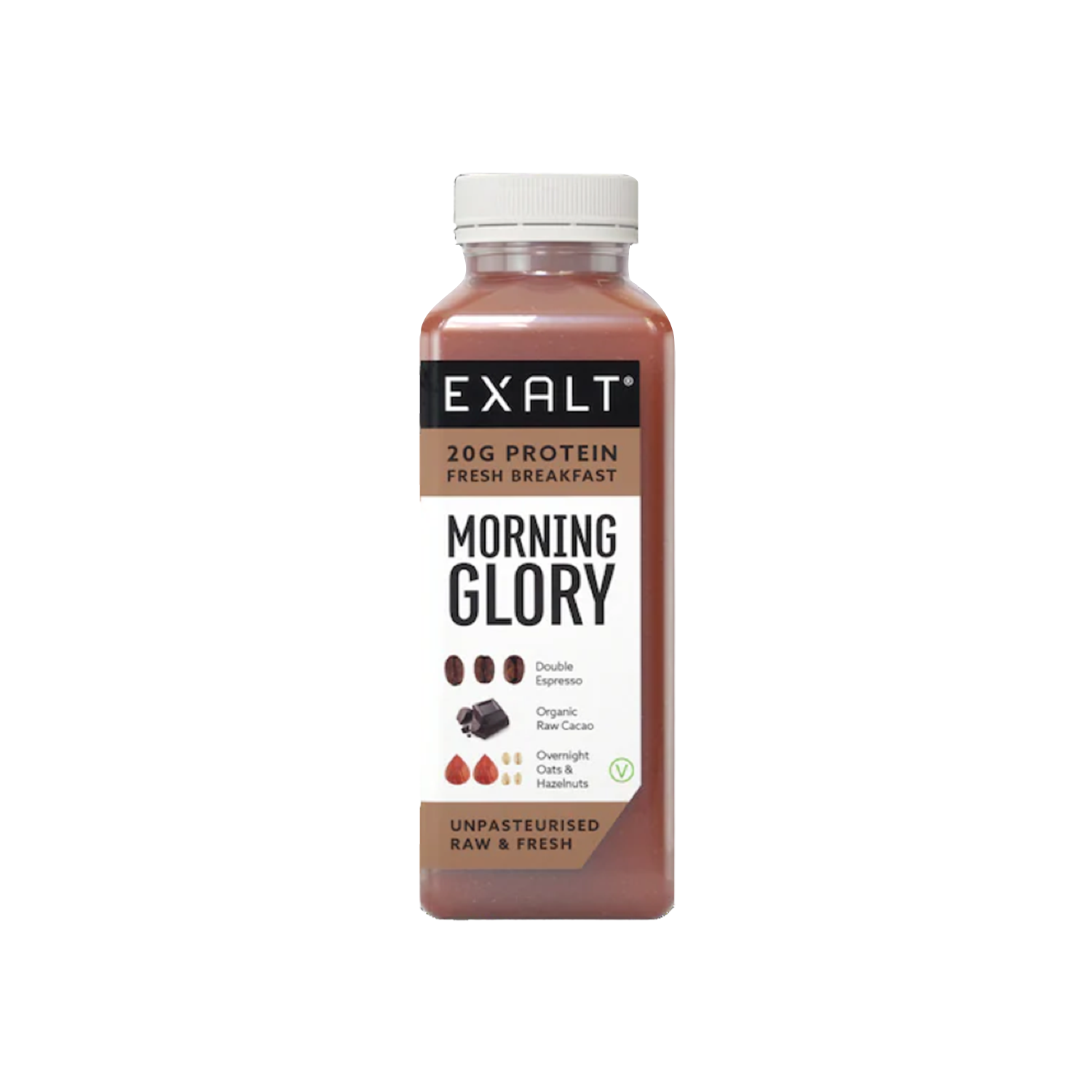The ultimate cold-pressed vegan breakfast smoothie, Morning Glory combines a double shot of Guatemalan espresso and 20g EXALT Cacao Vegan Protein with overnight oats, dates, hazelnuts, and creamy hazelnut milk.