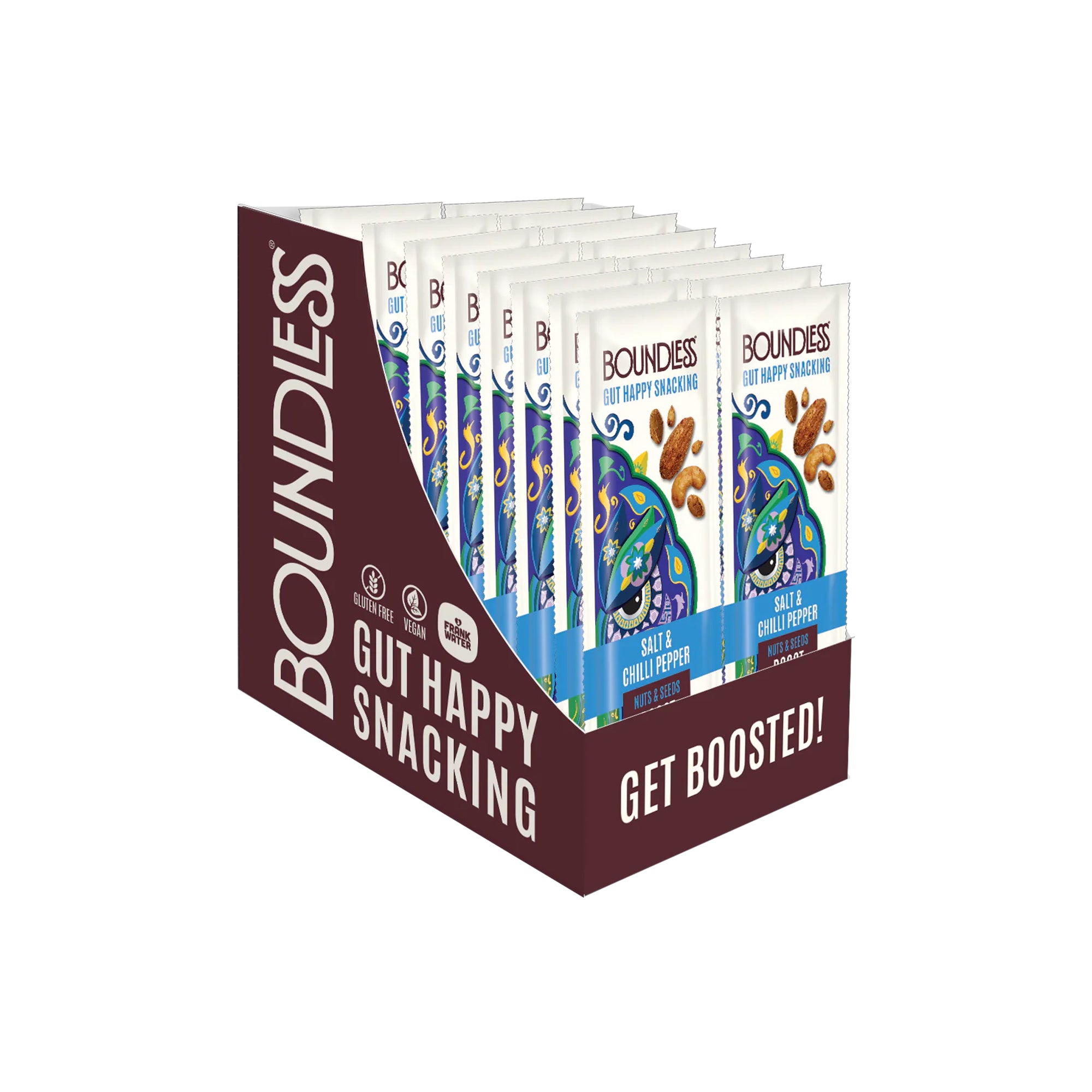 Made with non-GMO and 100% natural ingredients, these delicious snacks are a mix of almonds, cashews, pumpkin seeds and sunflower seeds spiced with classic salt and chilli pepper. Salt & Chilli Pepper Nuts & Seeds boast plant-based protein, gut friendly fibre, and are vegan friendly and gluten-free.