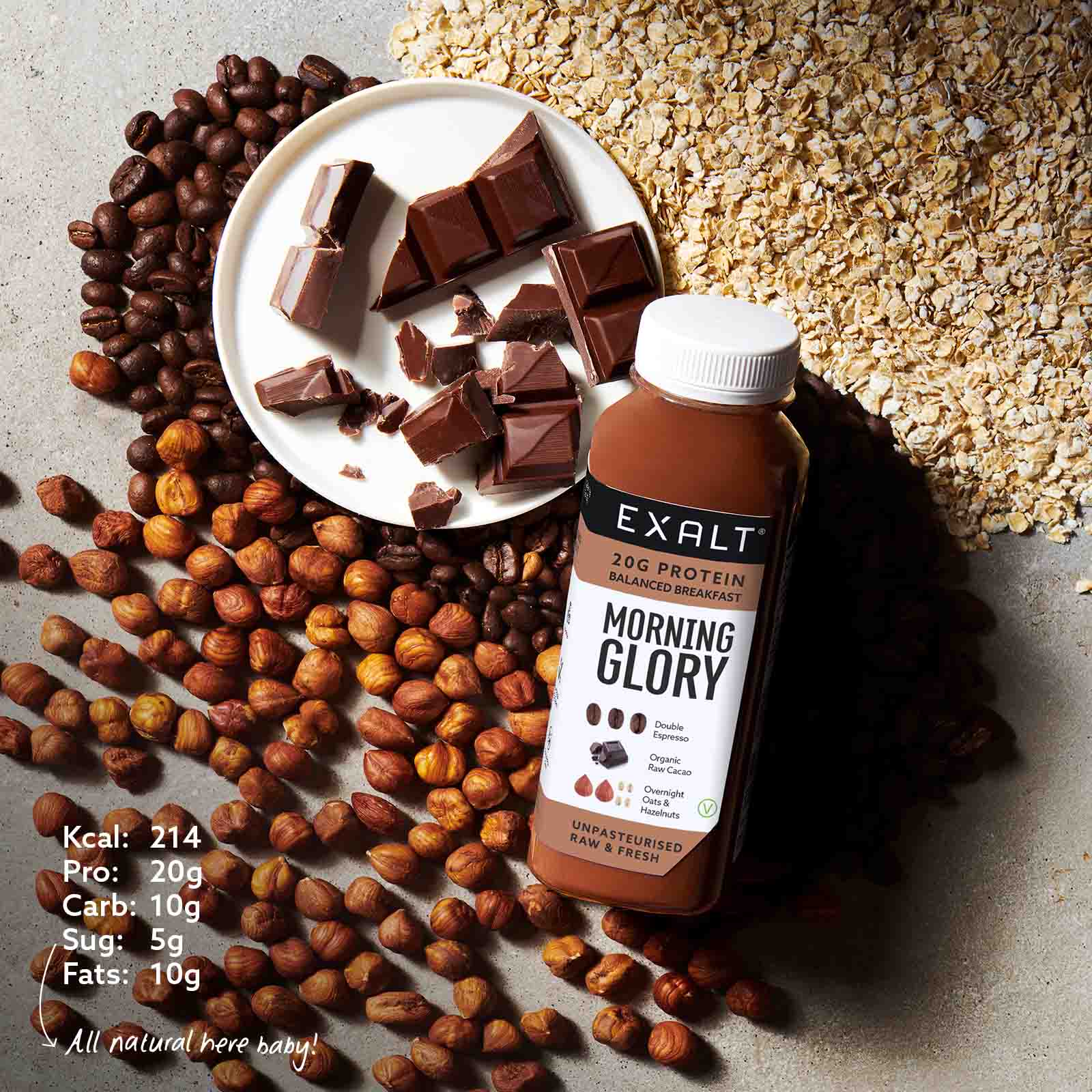 The ultimate cold-pressed vegan breakfast smoothie, Morning Glory combines a double shot of Guatemalan espresso and 20g EXALT Cacao Vegan Protein with overnight oats, dates, hazelnuts, and creamy hazelnut milk.