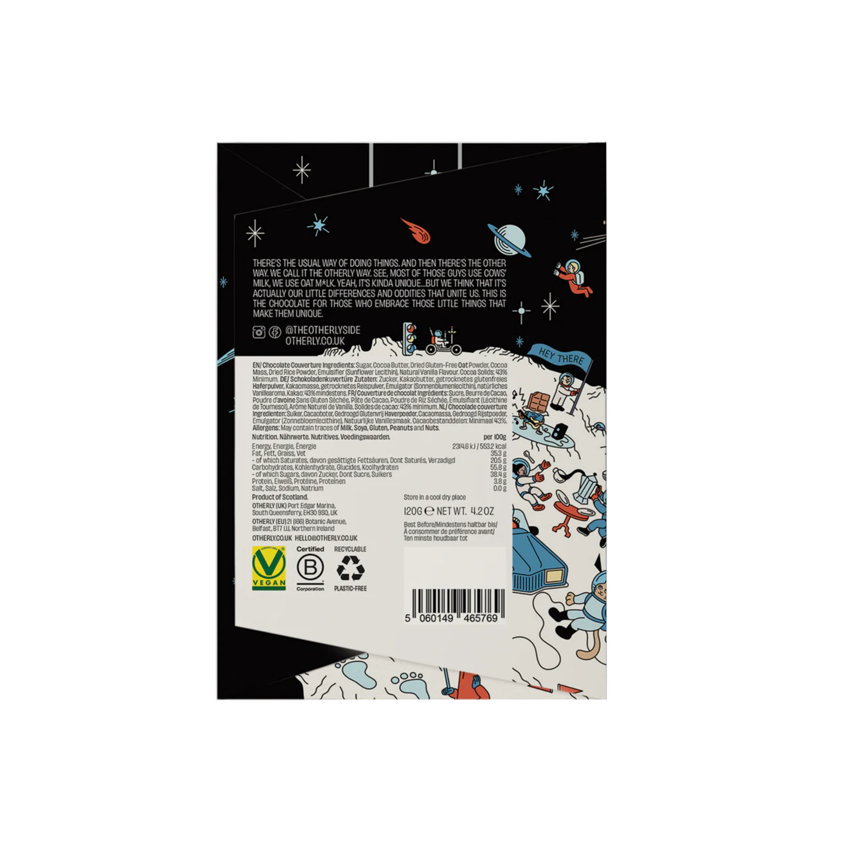 Experience the indulgent, creamy and one-of-a-kind taste of OTHERLY Plain Oatm*lk Chocolate Bar. Made with 43% cacao content sourced from the finest cocoa beans in Colombia and blended with oat powder. This vegan chocolate boasts exceptional roasted cacao notes and a distinctive sweetness that enhances the delicate and authentic biscuity and cereal flavours of oats.