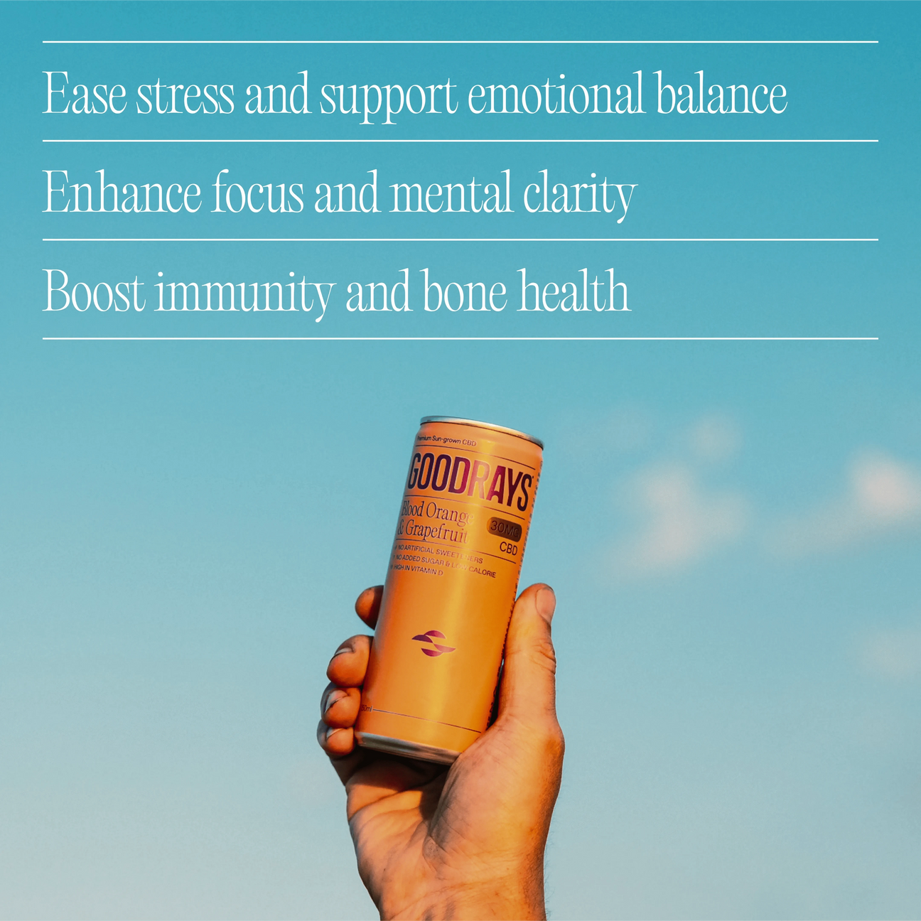 Get the natural benefits of CBD with this delicious Blood Orange and Grapefruit sparkling drink. Sourced from sustainable Colorado-grown cannabis, each serve contains 30mg of safety tested CBD without any artificial ingredients or added sugar – just 33 calories! 100% vegan.