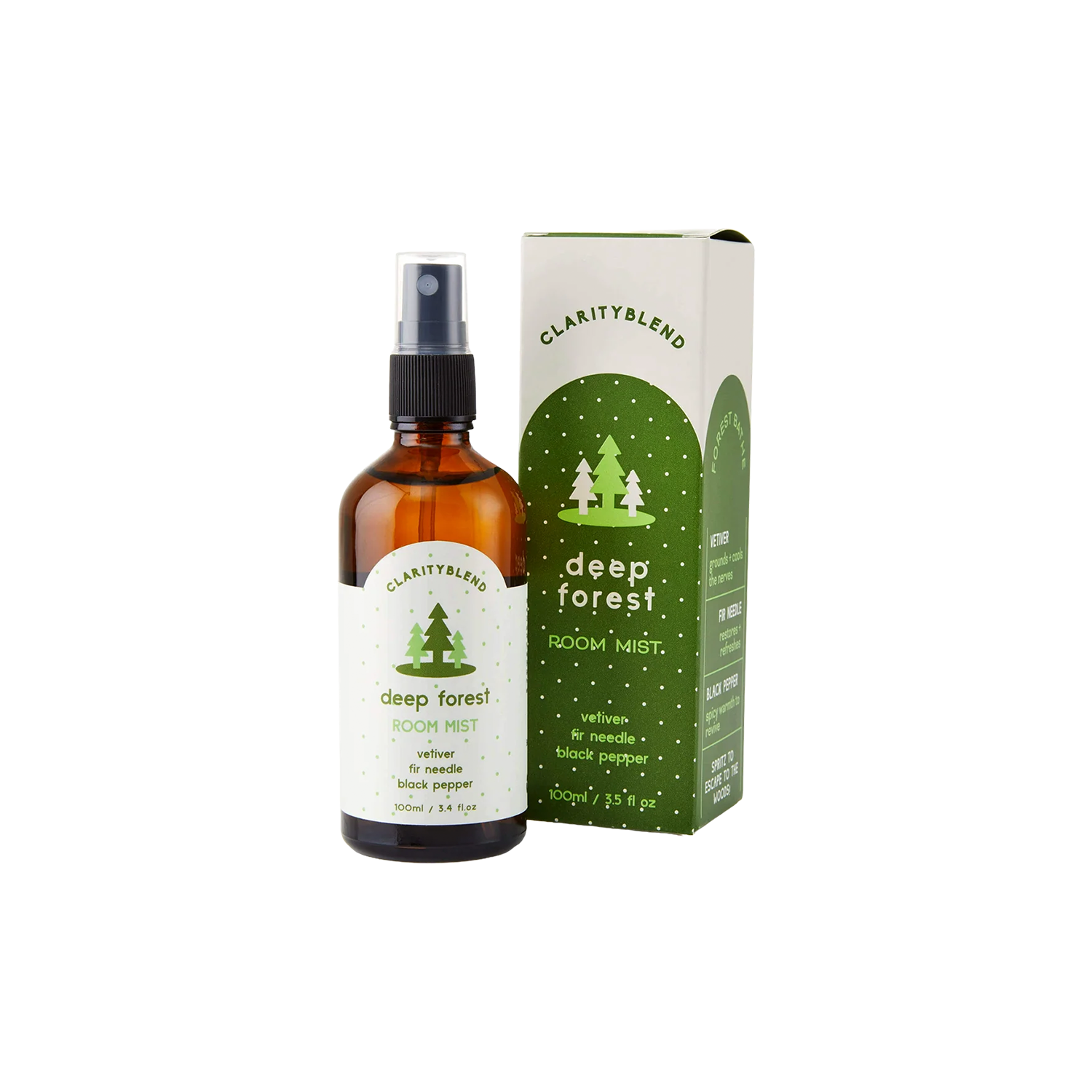 Deep Forest room mist is a grounding blend for a forest-bathing experience with vetiver, fir needle and black pepper.
