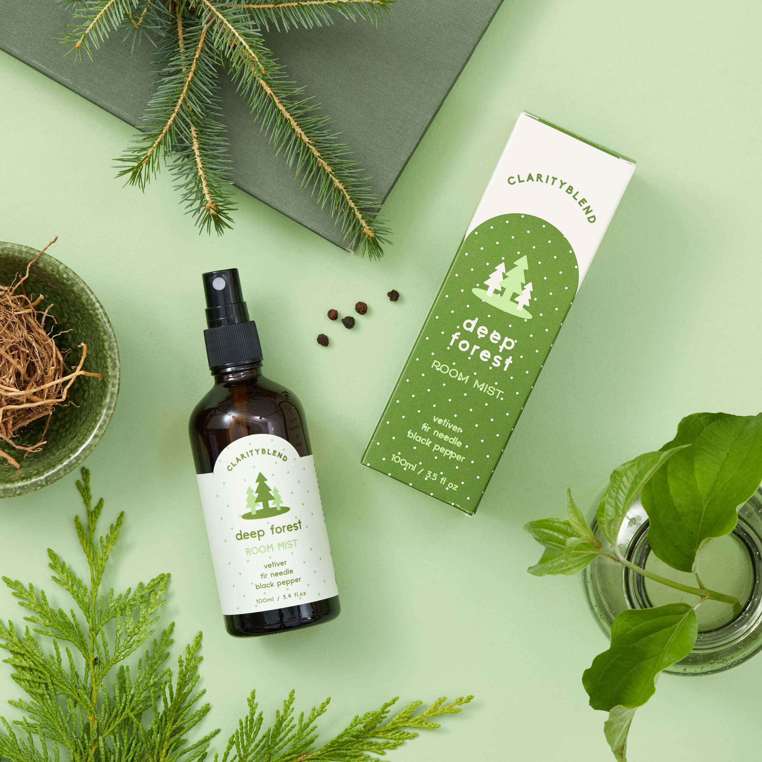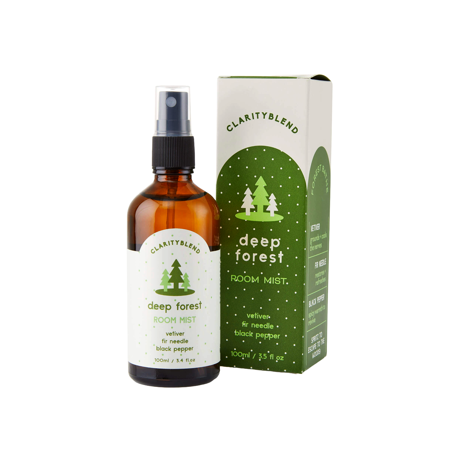 Deep Forest room mist is our grounding blend for a forest-bathing experience with vetiver, fir needle and black pepper.