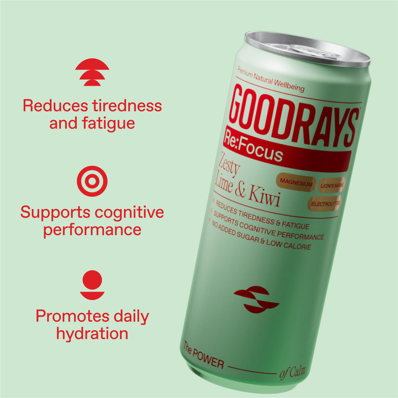 Experience the power of Re:Focus, a premium blend of Vitamin D, Lion's Mane and Ashwagandha to help you feel focused, energised and recharged. Each can also contains essential electrolytes for daily hydration with natural kiwi and lime flavouring. This vegan adaptogen drink is low in calories, made without artificial sweeteners and contains no added sugar.