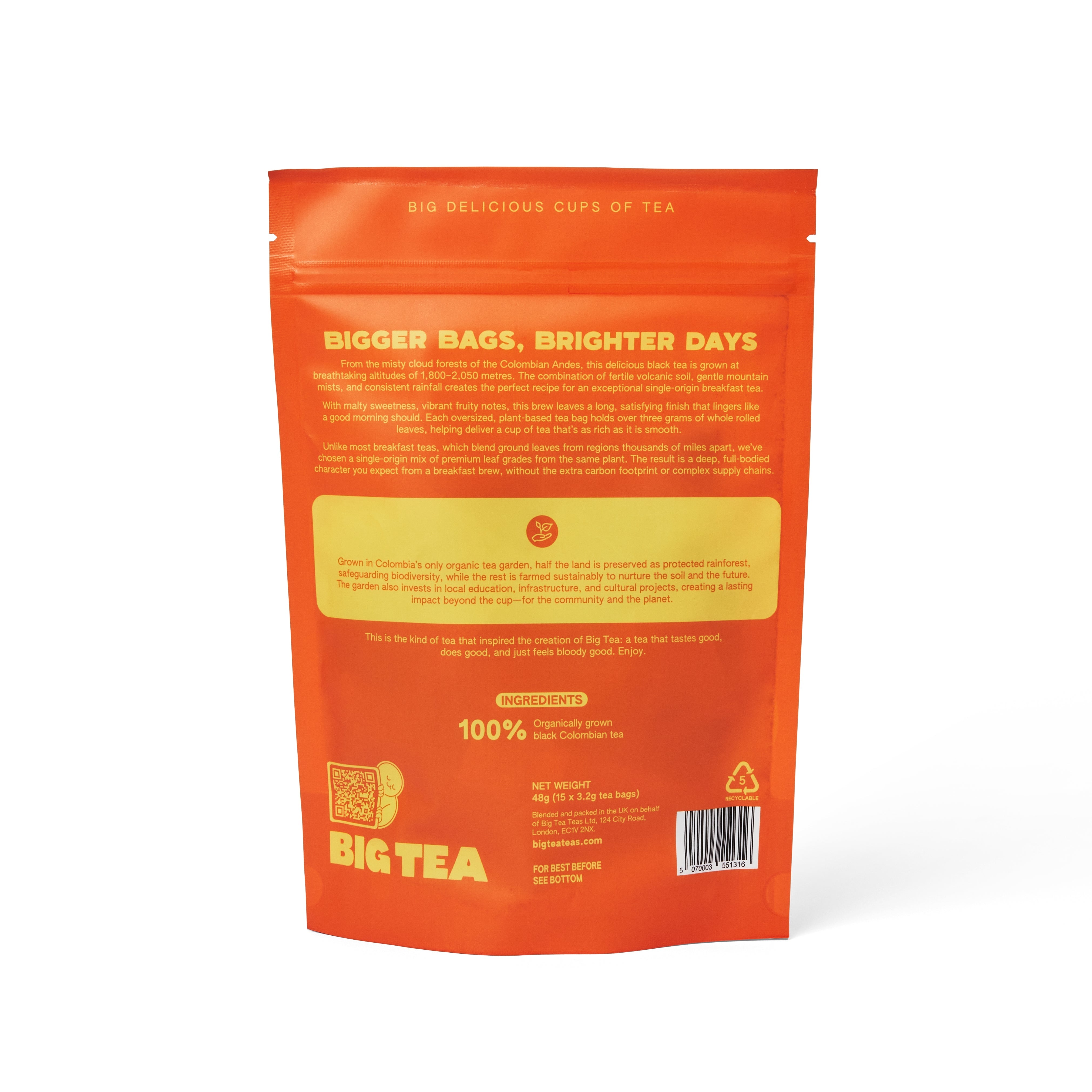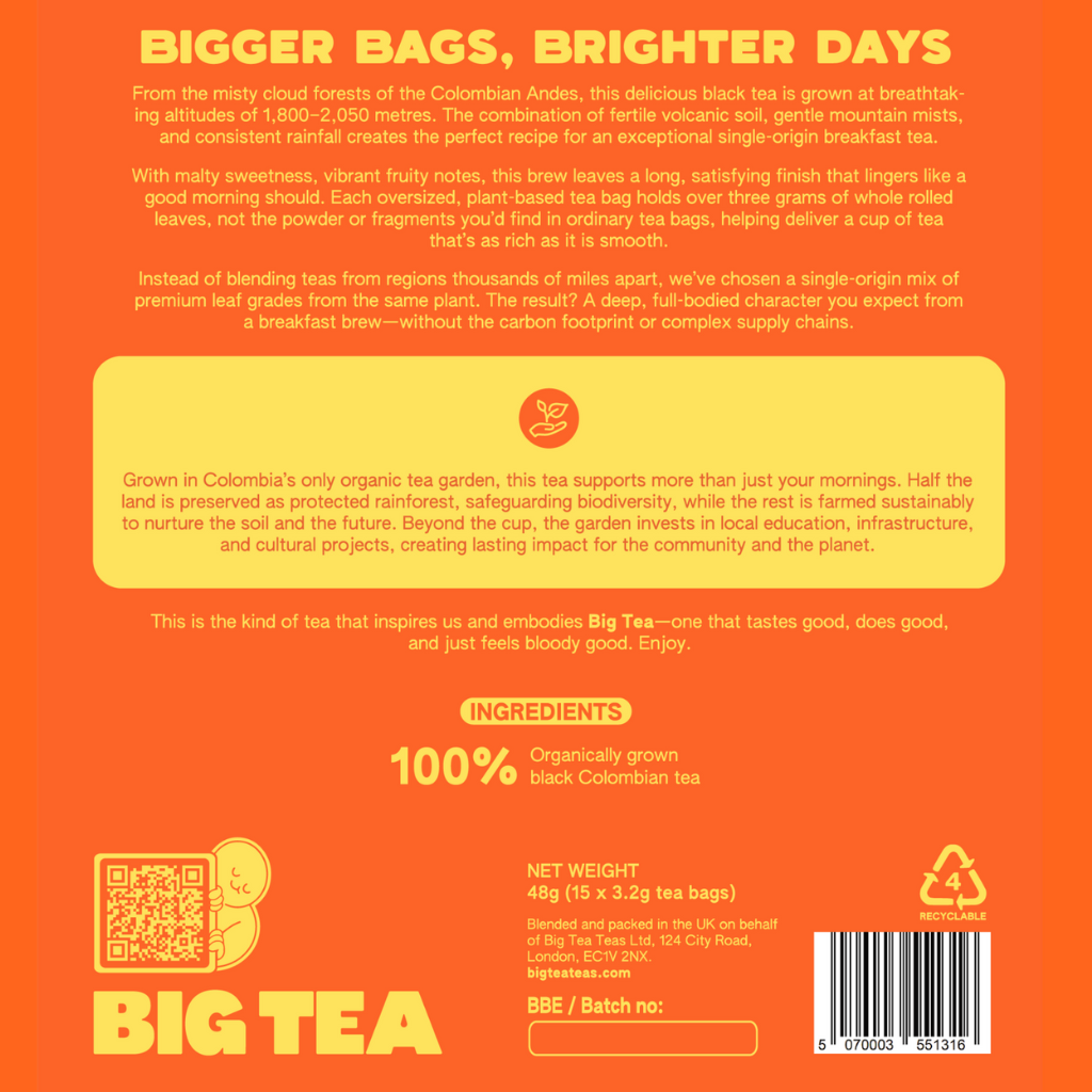 Discover the exceptional character of Colombian Breakfast Tea, a single-origin black tea sourced from the lush Andes mountains. Grown at elevations between 1,800–2,050 metres in volcanic soil enriched by mountain mists and steady rainfall, these premium leaves develop a distinctly malty profile with subtle fruity undertones. Each plant-based tea bag contains over three grams of whole rolled leaves, ensuring a full-bodied, smooth cup with a lingering finish. Unlike conventional breakfast blends that combine leaves from multiple continents, single-origin sourcing means you're enjoying a pure, consistent flavour whilst supporting a simpler, more transparent supply chain. Experience the difference that altitude, terroir, and thoughtful sourcing can make in your morning cup.