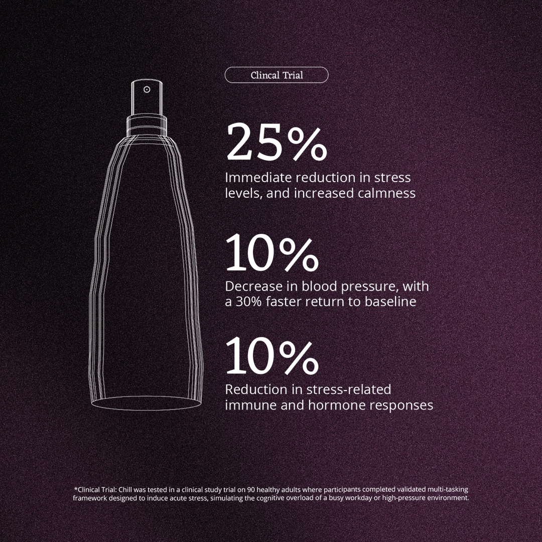 *Clinical Trial: Chill was tested in a clinical study trial on 90 healthy adults where participants completed validated multi-tasking framework designed to induce acute stress, simulating the cognitive overload of a busy workday or high-pressure environment.