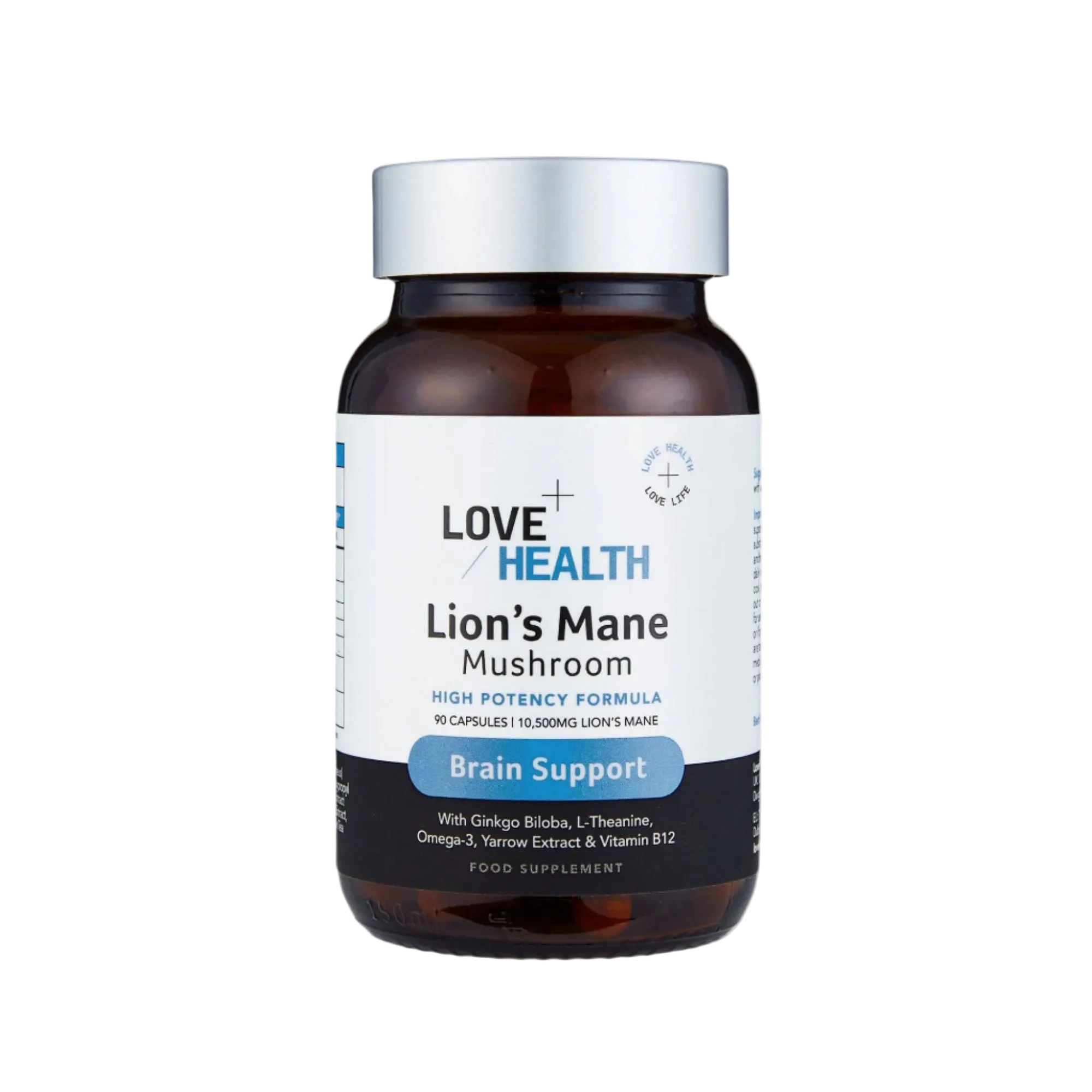 Lion's Mane Mushroom (Hericium erinaceus) 10:1 Extract, Capsule Shell (Hydroxypropyl Methylcellulose), Vegan Algal Omega-3 Extract (10% DHA), Yarrow (Achillea millefolium) Extract, Ginkgo Biloba Powder, L-Theanine (Green Tea Extract), Vitamin B12 (Cyanocobalamin)