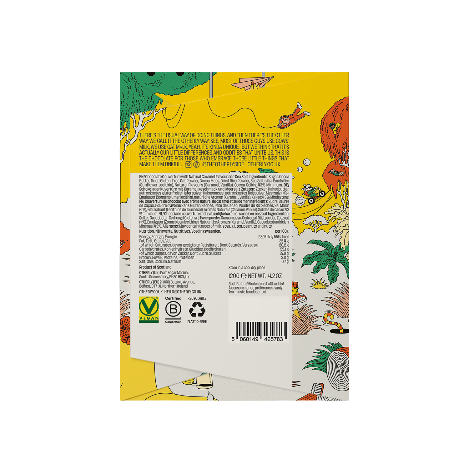 Featuring rich and creamy Colombian cocoa and oat powder, OTHERLY's Salted Caramel Oatm*lk Chocolate Bar offers a perfectly balanced blend of decadent caramel and sea salt flavours, complemented by notes of chocolate and a smooth, creamy texture. Indulge in this plant-based treat and experience the best of both worlds - wholesome ingredients and delicious taste.