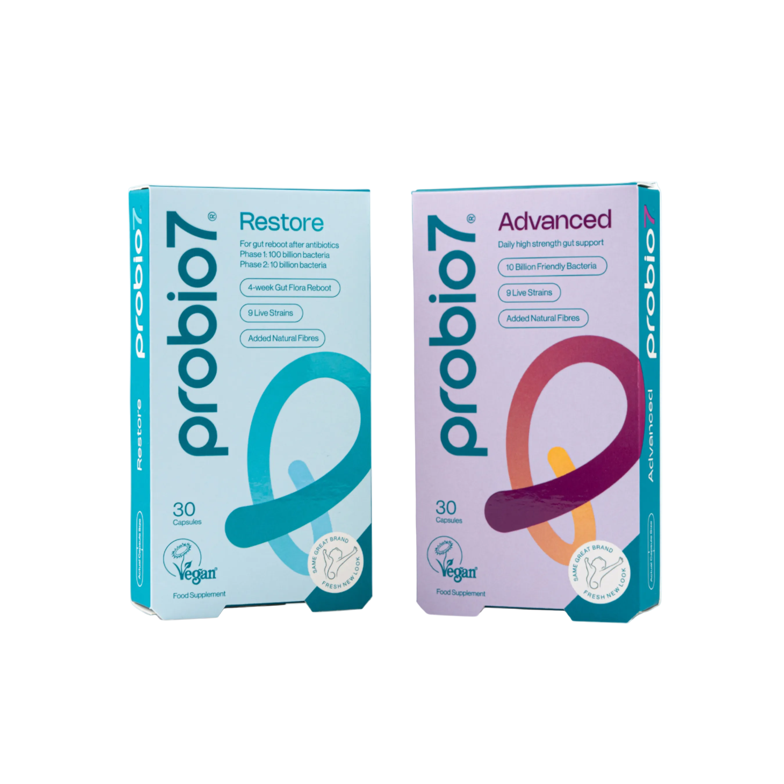 This Antibiotic Recovery Bundle is formulated to help replenish and restore your gut microbiome during and after a course of antibiotics. Combining our high-strength formulas Probio7 Restore and Probio7 Ultra, this 60-day programme helps support digestion, reduce side effects like diarrhoea, and bring your gut back into balance.