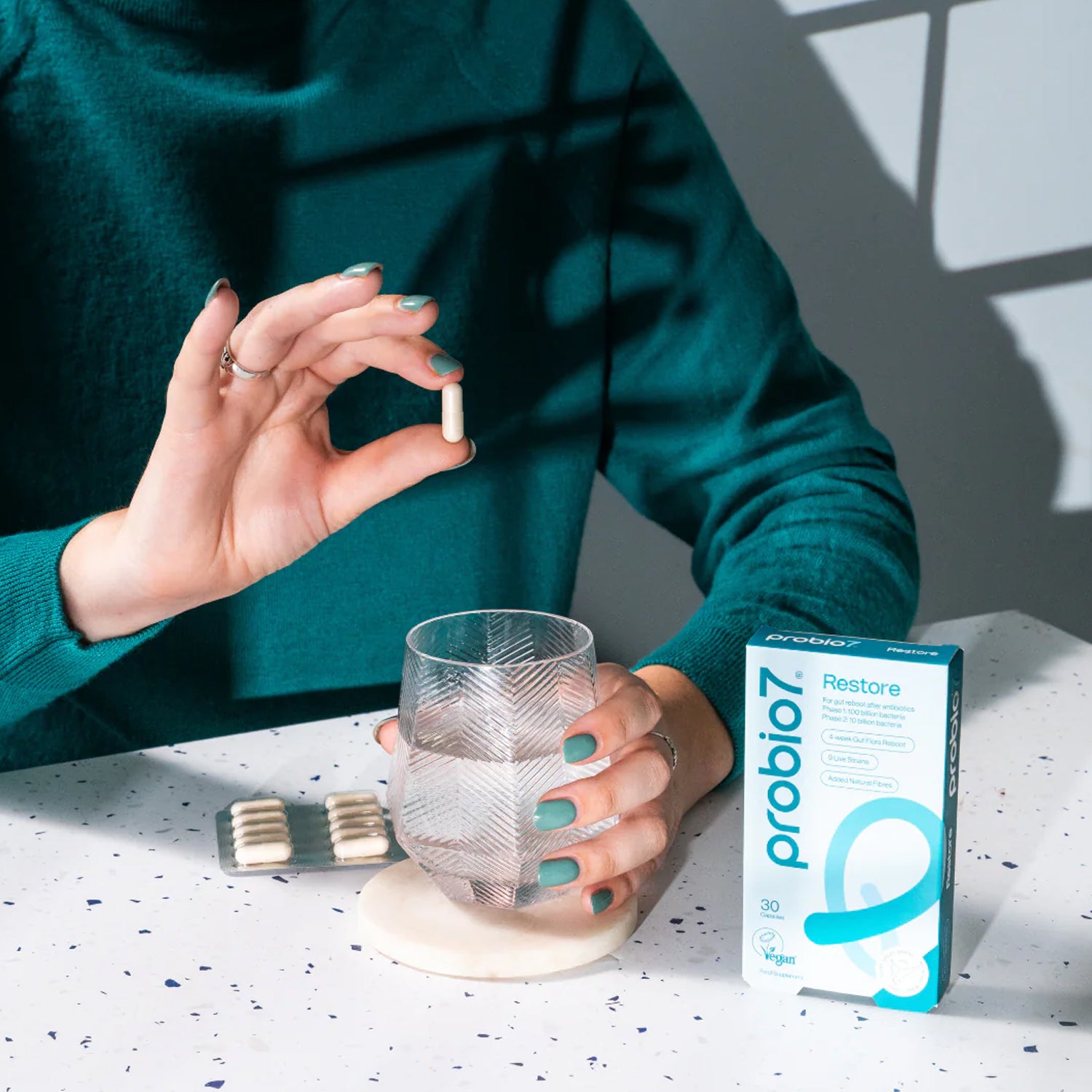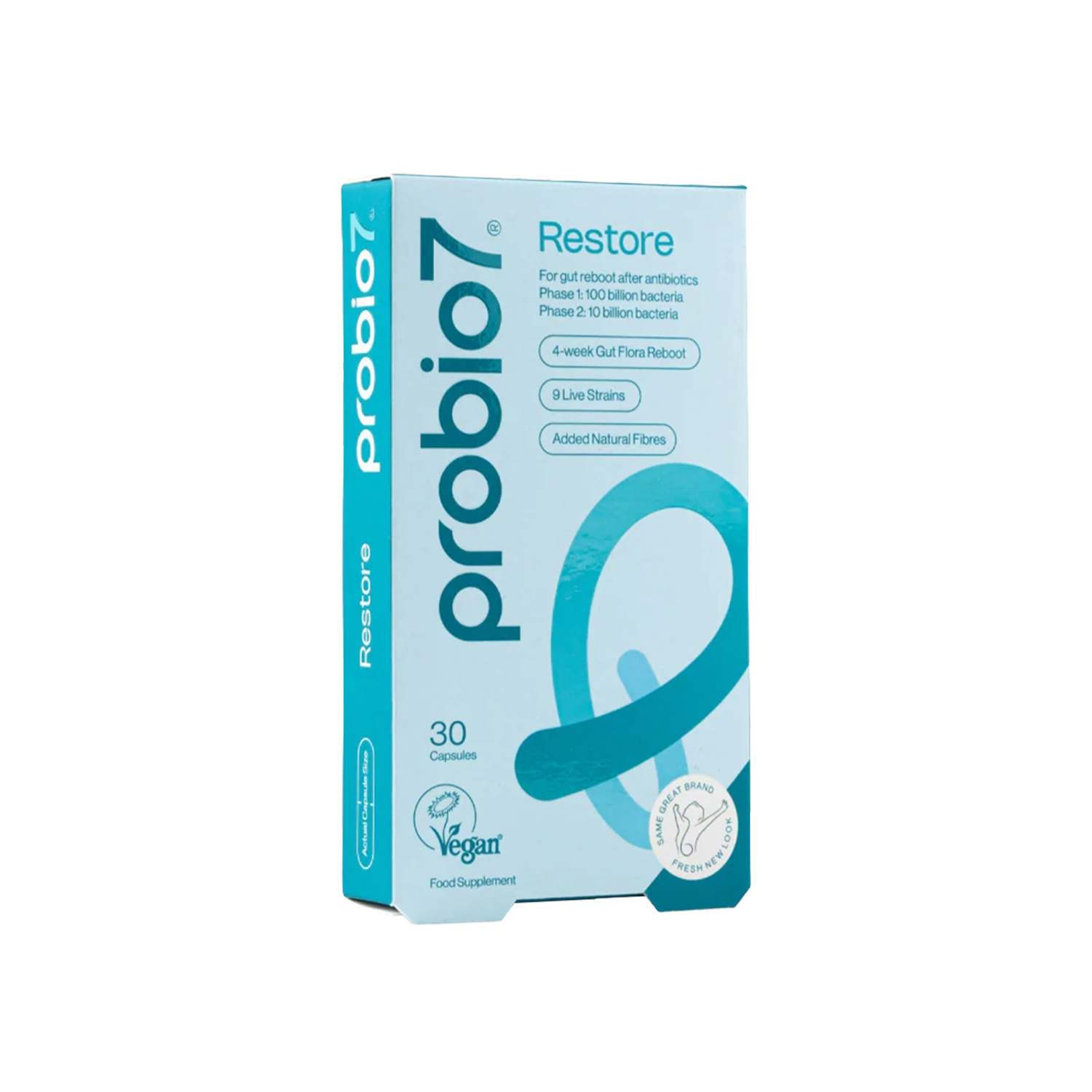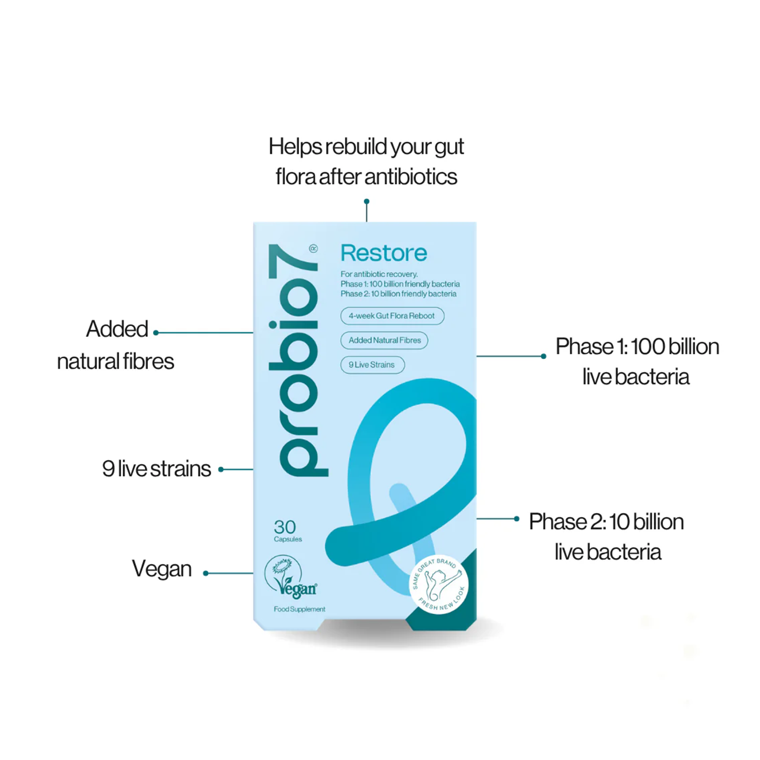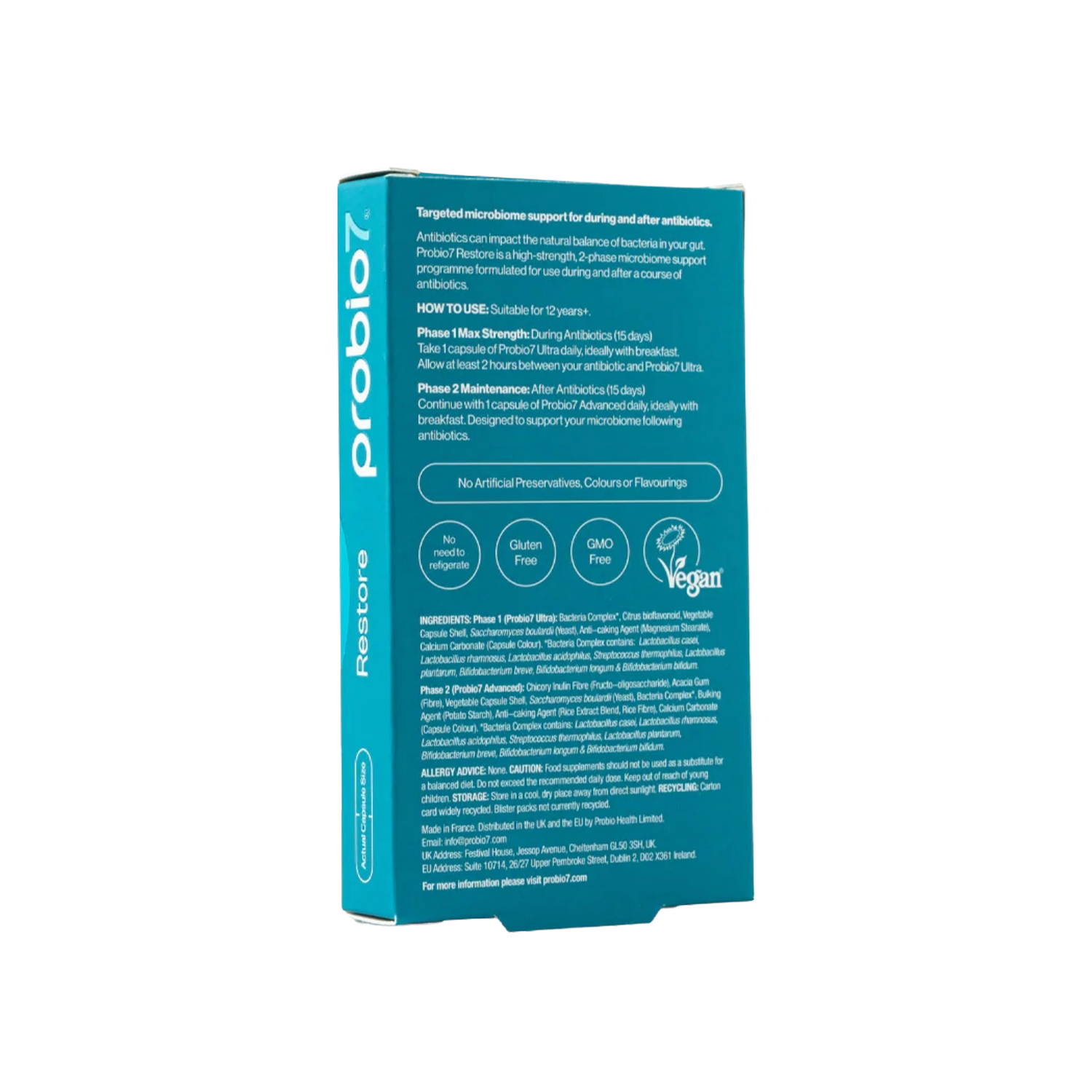 Antibiotic usage can disrupt the delicate balance of the gut microbiome, resulting in potential digestive symptoms. Probio7 Restore is a 30-day course of probiotics plus a strain of friendly yeast, Saccharomyces boulardii, to replenish good bacteria in the gut in two phases. The first provides 100 billion live bacteria per capsule, and an added bioflavonoid for extra support, during the first 15 days. After completing antibiotics, the second phase contains 10 billion live bacteria per capsule and natural fibre to nourish the bacteria and help restore your gut microbiome to its optimal state. These convenient probiotic capsules don't need to be refrigerated and are gluten-free, vegan, and free of artificial flavours or preservatives.