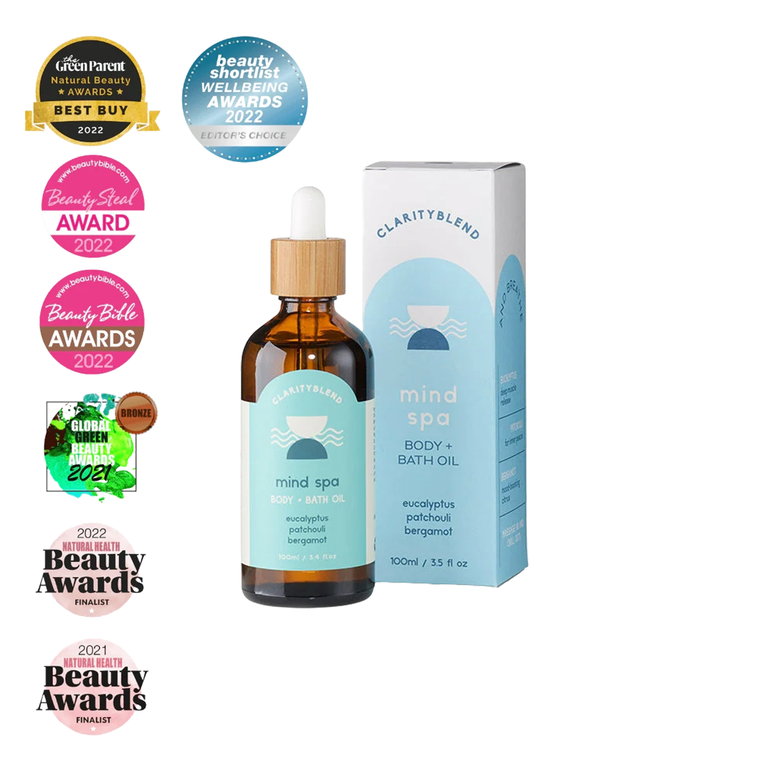 Mind Spa™ Body and Bath Oil incorporates four essential oils to promote relaxation and reduce stress. Patchouli has a deep, sweet, and earthy scent that can help lessen anxious feelings. Eucalyptus refreshes and clears the head for easy breathing, while Bergamot lifts the spirit with its light, citrusy aroma. Finally, Lemongrass provides stimulation and energy to combat feelings of fatigue. Mind Spa™ is the perfect way to take a few moments for yourself and reclaim your inner peace. With a base of jojoba and almond oils, this bath and body oil is nourishing and softening. Give yourself a spa-like experience any time you need with this multi award-winning natural body oil.