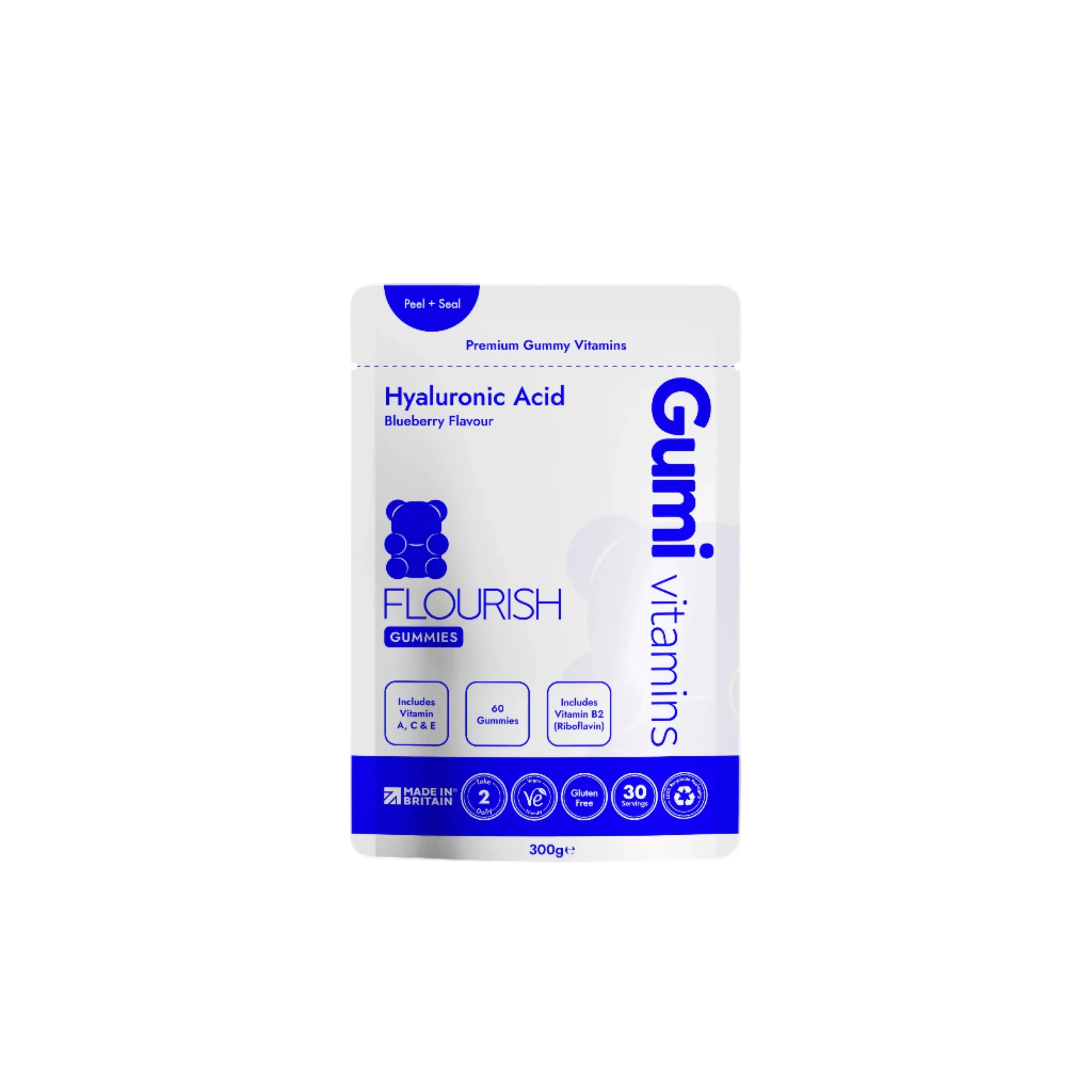 Discover Flourish Hyaluronic Acid Gummies, a delectable blueberry flavoured supplement packed with a powerhouse of skin-loving vitamins and Hyaluronic Acid, Mother Nature's moisture-locking secret for plump, radiant skin. Each gummy is infused with Vitamins A, C, E, and B2 for comprehensive skin nourishment. Vitamin A promotes skin cell renewal while Vitamin C stimulates collagen production and defends against environmental stressors. Vitamin E offers antioxidant protection to fight off free radicals and Vitamin B2 helps maintain skin hydration for a radiant glow from within. Expertly formulated with premium ingredients and free from artificial additives.