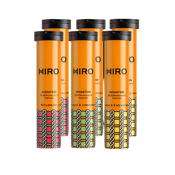 Enhance hydration and muscle function with HIRO's Hydration supplement, award-winning tablets containing key electrolytes and minerals. Each tablet contains 3 bananas worth of Potassium and more Zinc than 10 cups of spinach. This nutritional complex protect cells from damaging free radicals, promotes muscle recovery, and supports the immune system. Try all three flavours - Ginger & Lemongrass, Lemon & Elderflower, and Watermelon - with this variety pack!