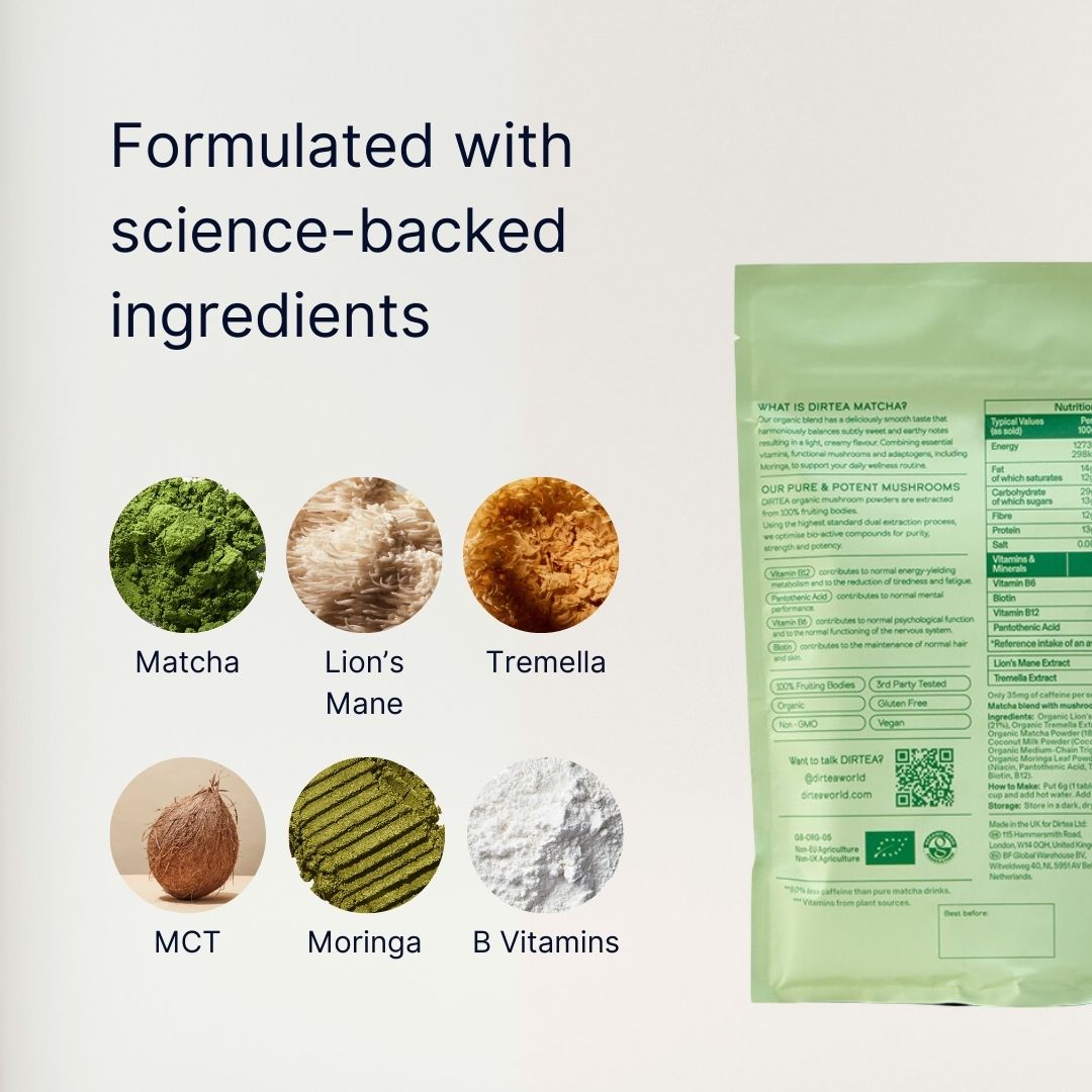 DIRTEA Matcha Mushroom Super Blend isn’t just delicious - it’s a powerhouse for your mind and body. Made with 100% pure ceremonial-grade Japanese matcha, Lion’s Mane and Tremella mushroom extracts, this powder enhances focus, boosts energy, and supports your nervous system with every sip. Fortified with an organic B vitamin complex, including B5, B6, Biotin and B12, this mushroom matcha blend provides steady energy and calm focus, supports psychological function, boosts energy levels, and promotes healthy hair, skin, and nails. Enjoy the velvety, smooth taste that makes wellness indulgent.