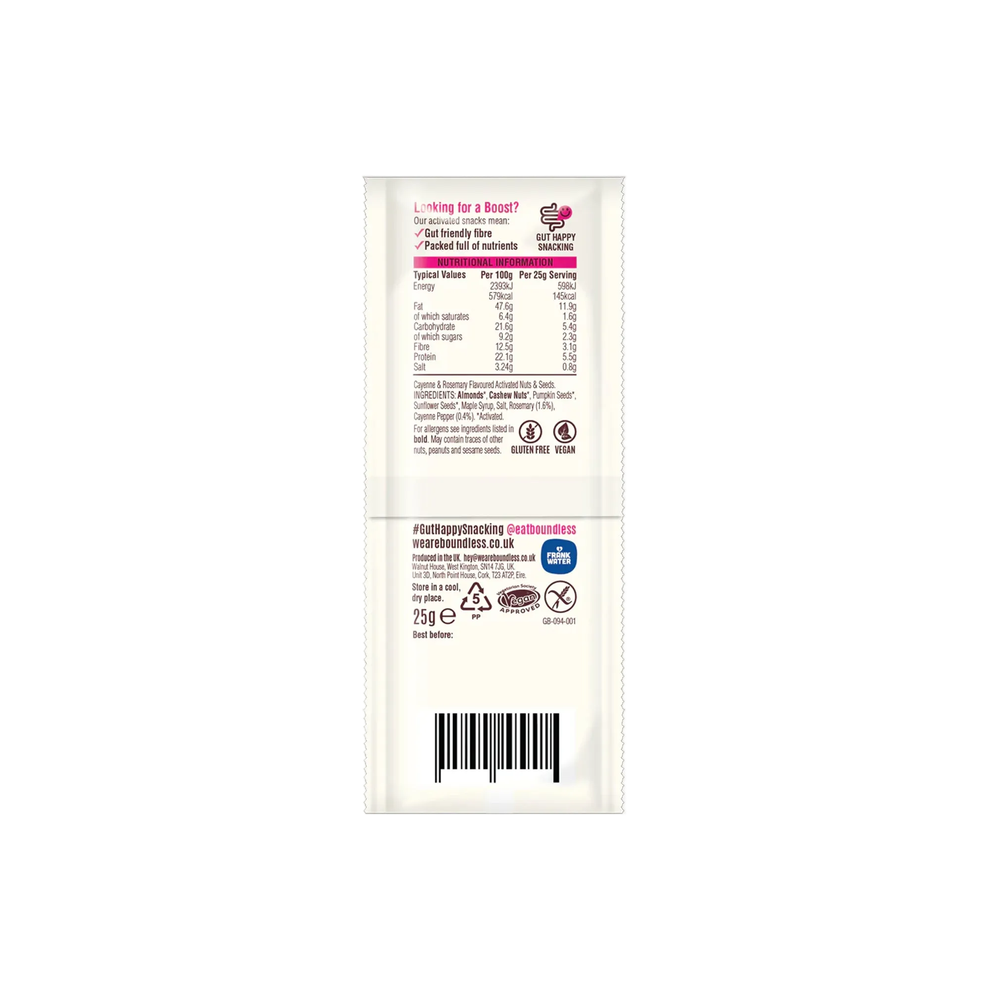 Made with non-GMO and 100% natural ingredients, these delicious snacks are a mix of almonds, cashews, pumpkin seeds and sunflower seeds spiced with cayenne pepper and rosemary. Sweet Chilli Nuts & Seeds boast plant-based protein, gut friendly fibre, and are vegan friendly and gluten-free.