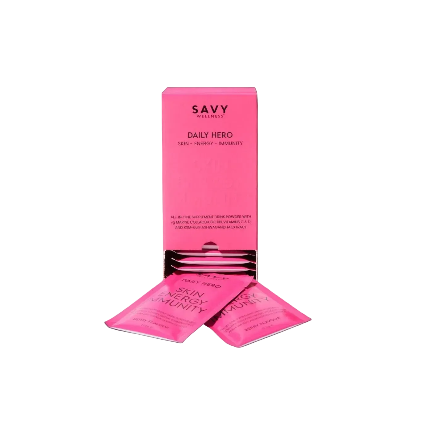 Each sachet combines five essential products: a Multivitamin with Vitamin B Complex, Vitamin D, 1000mg Vitamin C, 7g Hydrolysed Marine Collagen, and an adaptogen blend of KSM-66 Ashwagandha®, Rhodiola and Holy Basil. Savy's sustainably-sourced marine collagen is highly stable and comes from tropical freshwater fish, while KSM-66 Ashwagandha® offers the highest concentration and most bioavailable full-spectrum root extract available. Plus, Daily Hero All-in-One Supplement Powder is caffeine-free, naturally flavoured with Açai berries, and sweetened with Stevia.
